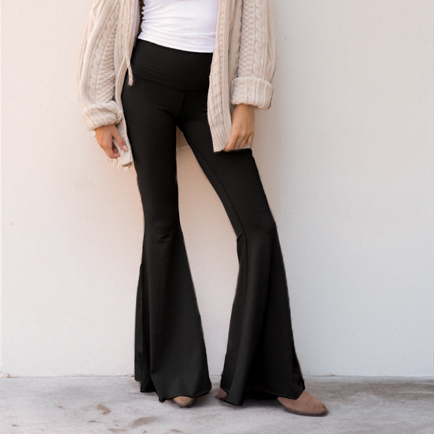 Woman wearing black flared pants with cut-out design in front of a white wall.