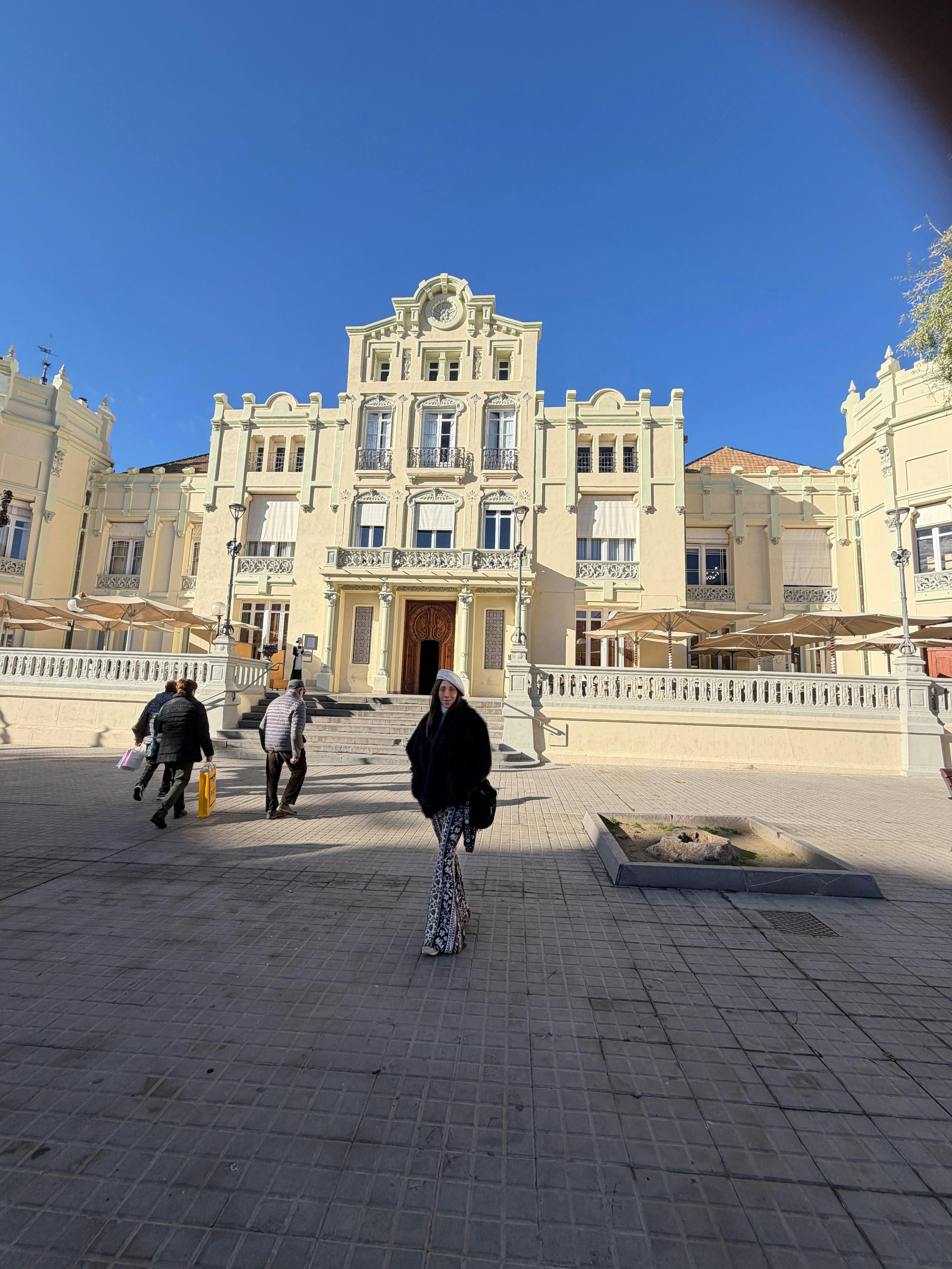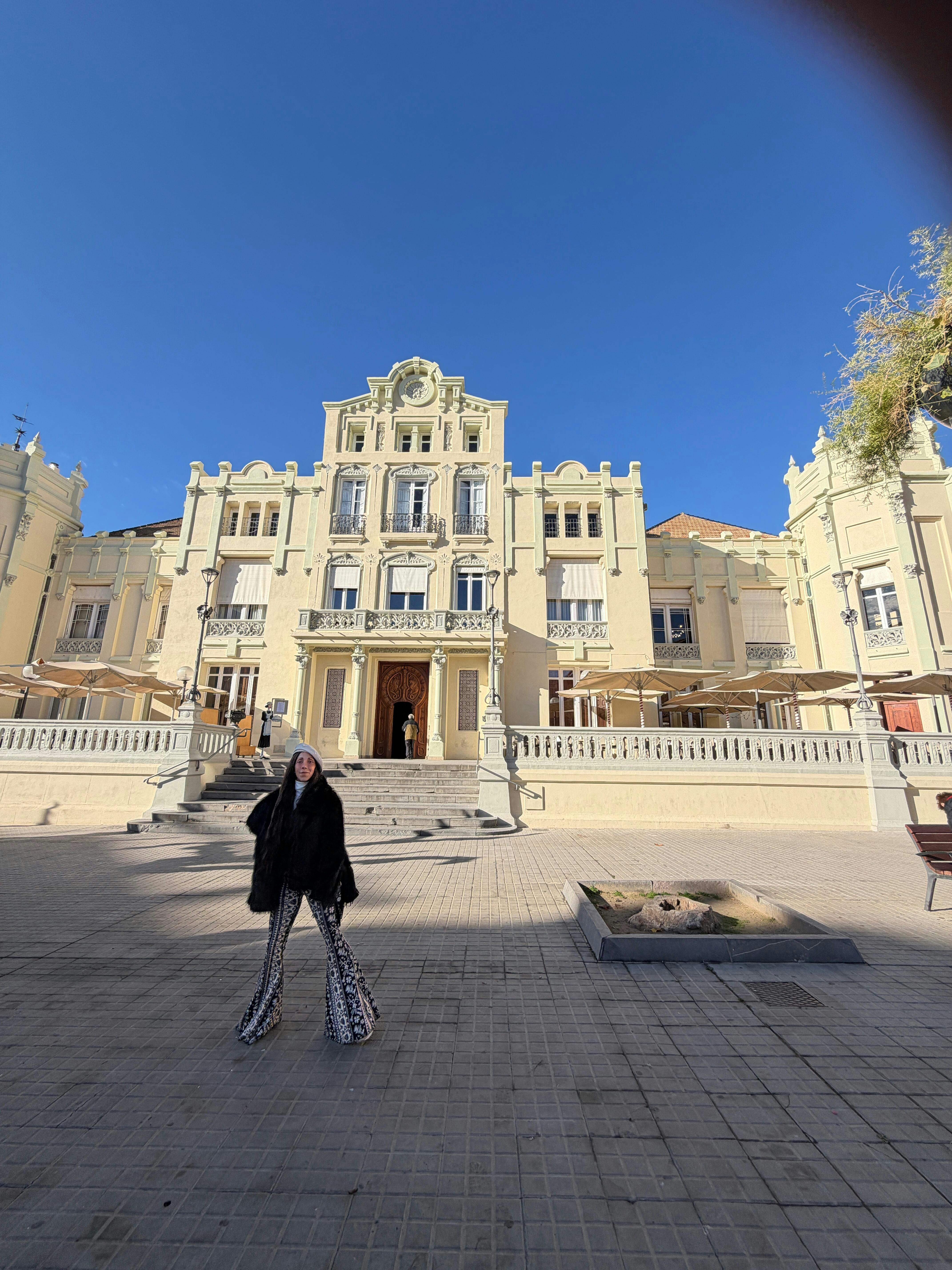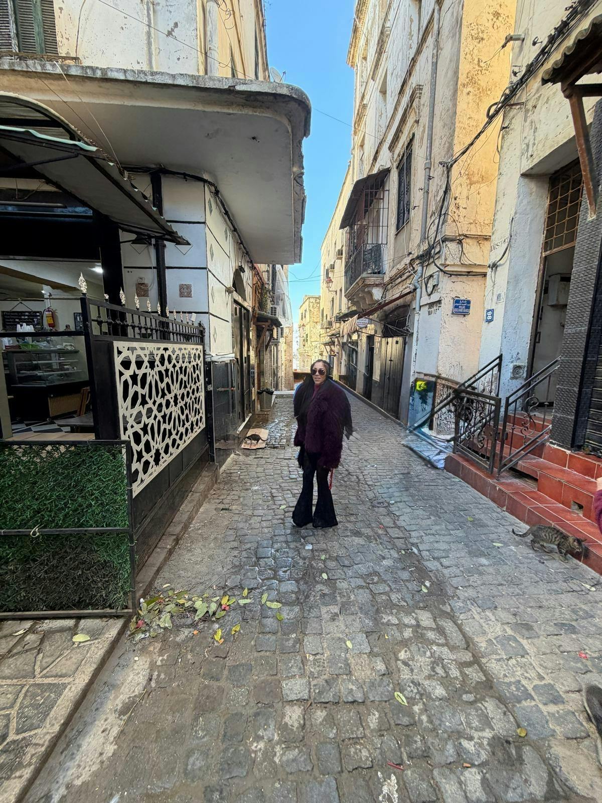 Person wearing a Rolling Stones tank top and leopard print pants leaning against a brick wall.